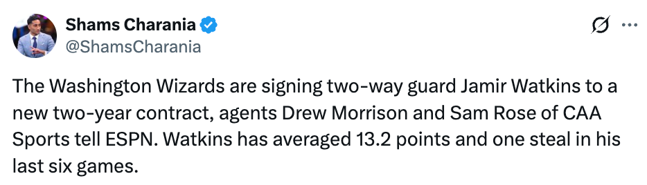 2026-02-27 01:00北京时间2月27日,据名记Shams报道,华盛顿奇才队将与双向合同后卫贾米尔-沃特金斯签下一份为期两年的新合同。在过去的六场比赛中,沃特金斯场均得到13.2分和1次抢断。