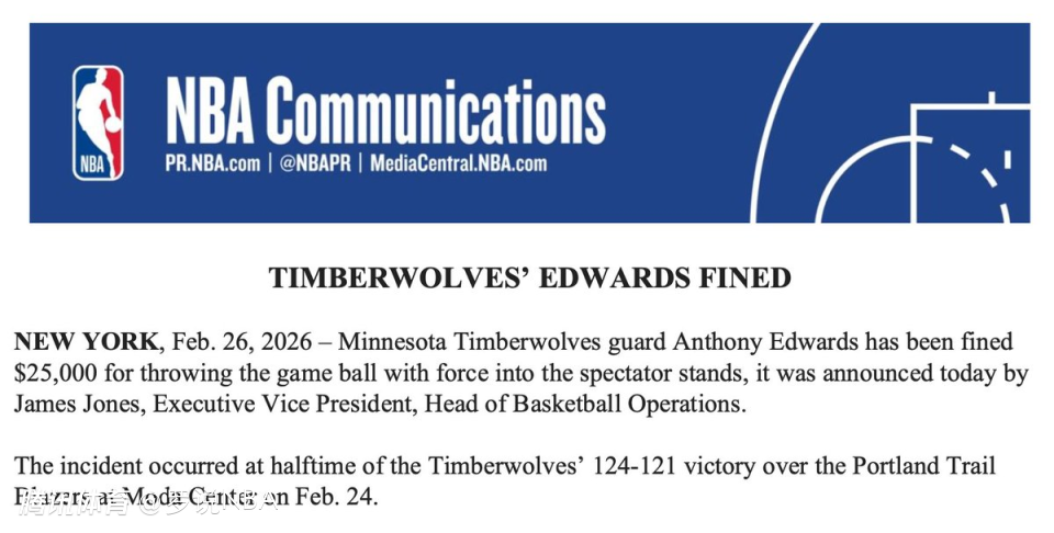 2026-02-27 05:50北京时间2月27日,NBA 篮球运营执行副总裁詹姆斯-琼斯今日宣布,明尼苏达森林狼队后卫安东尼-爱德华兹因用力将比赛用球扔向观众席,被罚款25000美元。该事件发生在 2 月 25日,森林狼队在摩达中心以124-121战胜开拓者队的比赛半场休息时。