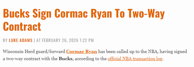 2026-02-27 06:10北京时间2月27日,根据NBA官方交易记录显示,威斯康星鹿群队球员科马克-瑞安已被征召至NBA,与雄鹿队签下一份双向合同。