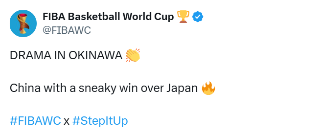 2026-02-27 08:20北京时间2月27日,2027年男篮世界杯亚洲区预选赛第二窗口期的焦点战昨晚在日本打响,中国男篮客场作战,在一度落后15分的不利局面下完成绝地反击,最终以87-80逆转击败日本男篮。赛后,国际篮联官方更新社交媒体,点评本场比赛:“冲绳的戏剧性时刻,中国男篮从日本偷走一场胜利!”