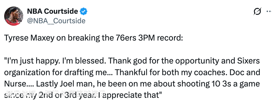 2026-02-27 11:10北京时间2月27日,NBA常规赛,76人以124-117击败热火,此役马克西拿到28分4篮板11助攻5抢断1盖帽,他也超越艾弗森,成为队史三分球命中数最多的球员,赛后他接受了媒体的采访。