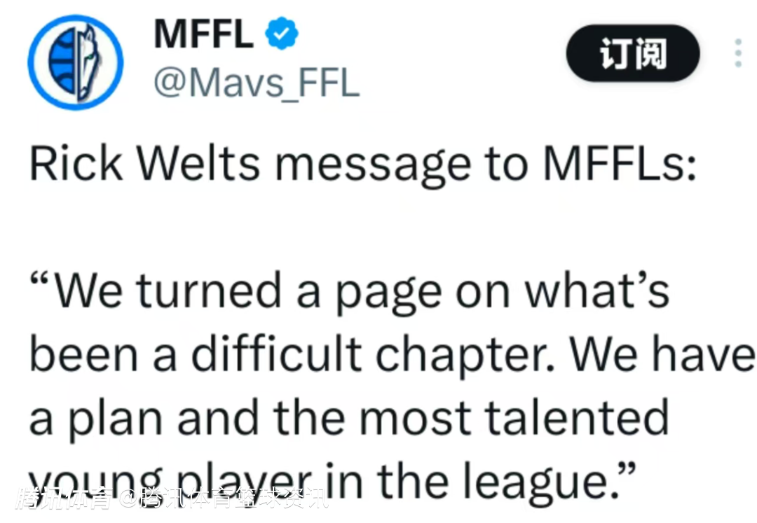 韦尔茨向独行侠球迷表态:“我们已然翻过了这段艰难的篇章,球队有着清晰的规划,还拥有联盟中最具天赋的年轻球员。”