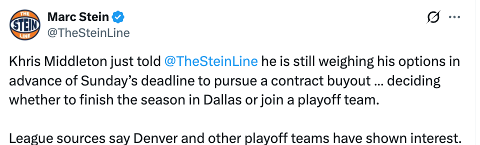 前不久,Stein就曾报道,达拉斯独行侠将把决定权交给米德尔顿本人,让他选择是留队打完整个赛季,还是与球队达成买断协议。独行侠方面也表达了希望米德尔顿下赛季继续留在阵中的意愿。后者将在今年夏天成为一名完全自由球员。