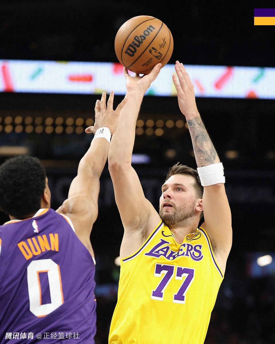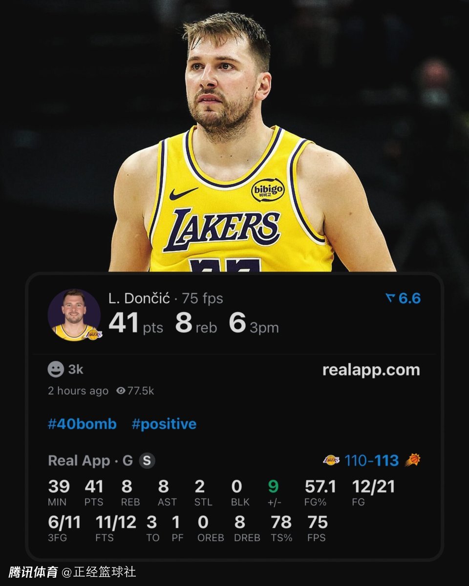 在本场比赛中,东契奇的进攻状态有些回暖,全场比赛,东契奇一共首发出场39分钟,21投12中,其中三分球11中6,罚球12中11,合计得到41分8篮板8助攻2抢断,同时还有3个失误,正负值为+9!不过,在比赛最后几分钟内,太阳队频繁攻击东契奇这个点,并且连连得手,湖人队最终吃到败仗。