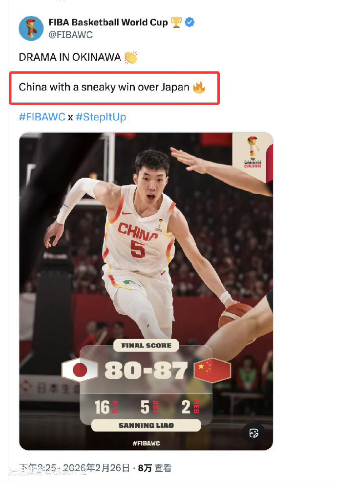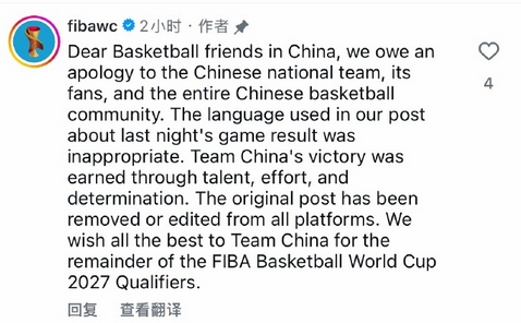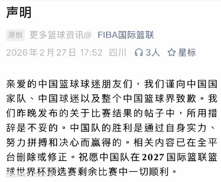 2026-02-27 20:10北京时间2月27日, FIBA国际篮联官方今日声明,因昨日比赛结果帖子的措辞不当而向中国男篮、中国球迷以及整个中国篮球界致歉。