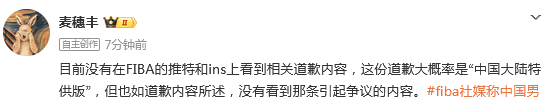 媒体人“麦穗丰”发文点评:目前没有在FIBA的推特和ins上看到相关道歉内容,这份道歉大概率是“中国大陆特供版”,但也如道歉内容所述,没有看到那条引起争议的内容。