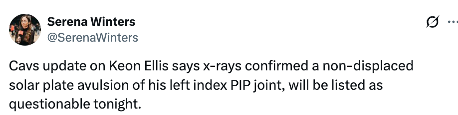 骑士官方:基恩-埃利斯左手食指无移位撕脱性骨折 尚不确定是否出战与活塞一役
