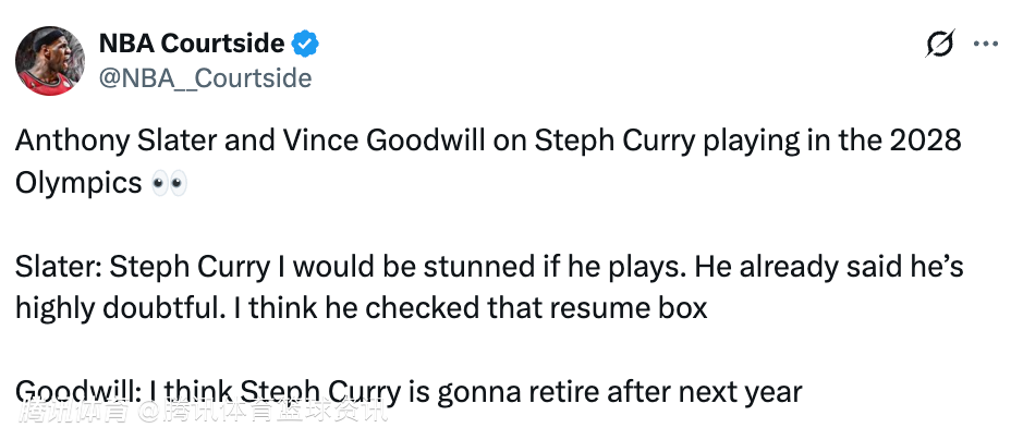 Slater表示:“如果库里还打奥运会,我会非常震惊。他已经明确表示自己出战的可能性极低。我认为他的职业生涯荣誉已经圆满了。”