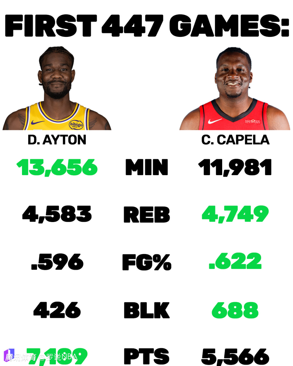 有球迷晒出了两人生涯前447场比赛的总数据对比,艾顿上场时间高于卡佩拉,但篮板、投篮命中率和盖帽都明显低于对方。