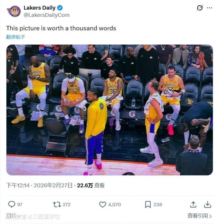 2026-02-28 07:10北京时间2月28日,NBA常规赛继续进行。湖人队近期状况十分糟糕,这引来了外界对于他们的猜测,湖人媒体LakersDaily晒出一张球队板凳席照片,詹姆斯、东契奇等人分开坐,他们的前景遭到看衰。