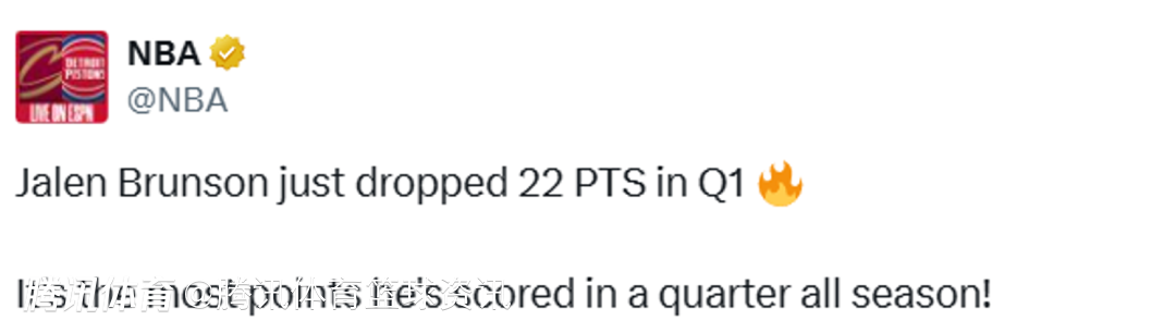 首节比赛,布伦森打满12分钟,投篮10中9,三分球3中3,拿到22分3篮板2助攻,且没有一次失误。单节22分,也创下他本赛季单节得分新高。