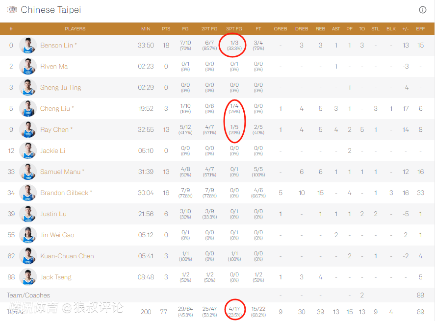 CBA三将方面,林庭谦是目前状态最好,对阵韩国的比赛,登场33分钟,10中7得到18分3篮板3助攻,陈盈骏12中5,得到13分5篮板4助攻。