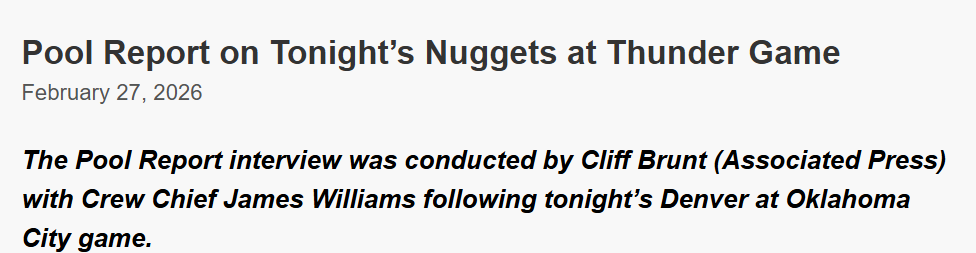 2026-02-28 14:50北京时间2月28日,NBA常规赛继续进行,掘金经过加时121-127不敌雷霆。赛后,美联社记者就当场判罚,对当值主裁判詹姆斯-威廉姆斯进行采访。