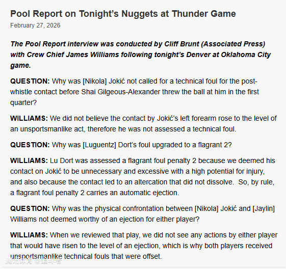 威廉姆斯回答:我们认为约基奇左前臂的接触没有达到违反体育道德行为的程度,因此他没有被吹罚技术犯规。