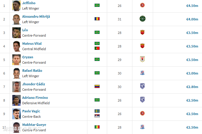 升班马辽宁铁人则以1301万欧元排名第5位,热菲尼奥以450万欧元的身价成为中超身价最高的球员,力压米特里策(400万)以及身价达到350万的维塔尔、克雷桑、莱昂纳多。