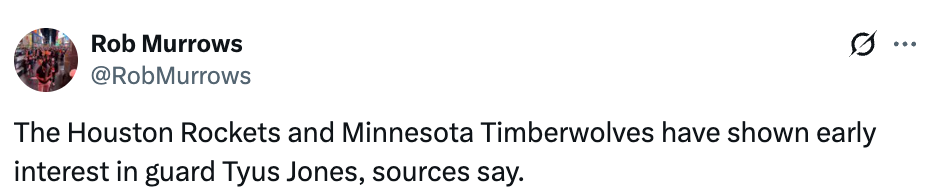 2026-03-01 00:20北京时间3月1日,据美记Rob Murrows报道,火箭和森林狼已经对泰鲁斯-琼斯表达出了初步兴趣。值得一提的是,琼斯生涯效力的首支球队正是森林狼,他曾在16-19年效力该队。