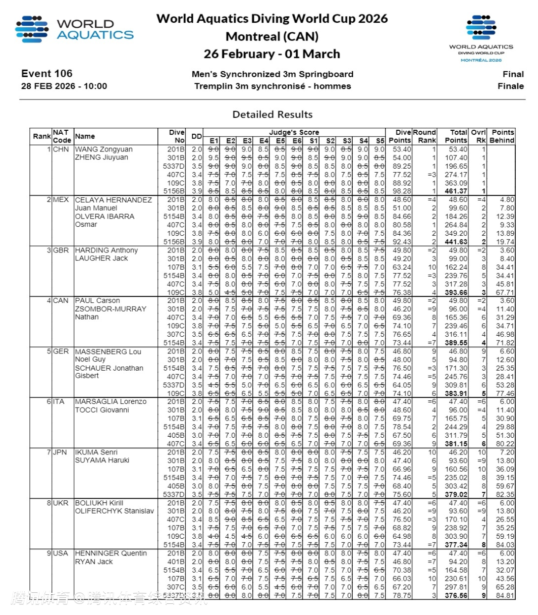 2026-03-01 01:00北京时间3月1日,跳水世界杯加拿大站结束男子双人三米板争夺,中国选手王宗源/郑九源除了第三跳,其余五跳全部是最高分,最终以461.37分夺得冠军。墨西哥(441.63分)和英国(393.66分)分获银铜牌。