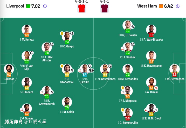 第43分钟,利物浦右侧角球,萨拉赫罚向禁区,埃基蒂克接范戴克头球摆渡,麦卡利斯特直接凌空抽射破门,利物浦3-0西汉姆联。