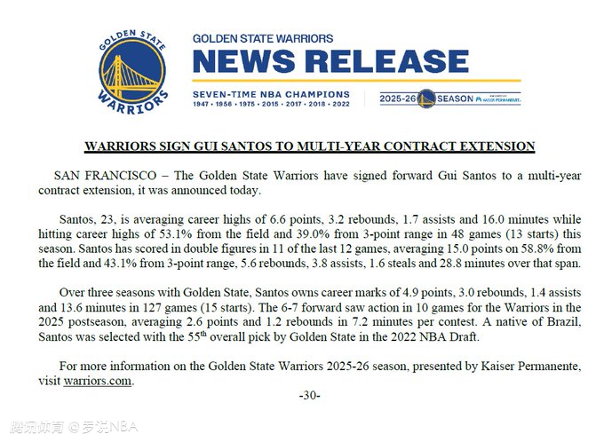 2026-03-01 05:30北京时间3月1日,勇士官方宣布,三年级前锋桑托斯已经与球队签下一份多年续约合同。据名记Shams报道,桑托斯签下的是一份3年1500万美元的续约合同,其中包含2028-29赛季球员选项。