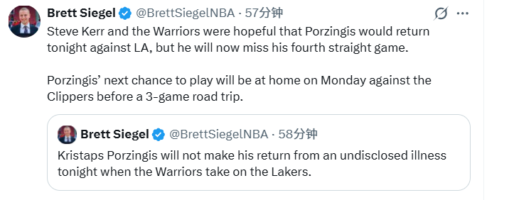 2026-03-01 06:00北京时间3月1日,NBA常规赛继续进行,勇士对阵湖人。赛前,勇士方面更新球队伤情报告,波尔津吉斯因未公开的疾病,将不会在今天勇士对阵湖人的比赛中复出。