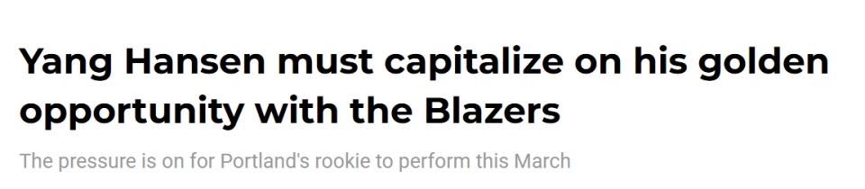 2026-03-01 06:20北京时间3月1日,开拓者93-109不敌黄蜂,目前29胜32负,排名西部第9。杨瀚森只获得最后2分15秒的垃圾时间,2中1得到2分1篮板。虽然他的上场时间依然很少,但波特兰媒体Rip City Project表示,杨瀚森得抓住3月的黄金机会。以下是文章内容——