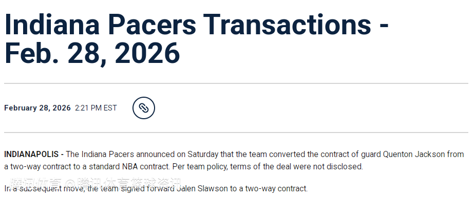 2026-03-01 07:00北京时间3月1日,步行者官方发布公告,宣布昆顿-杰克逊已正式转为标准合同,杰伦-斯劳森的双向合同也已正式敲定。