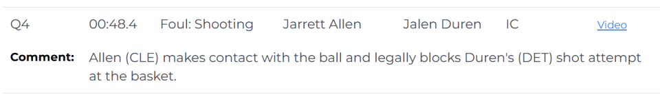第二次是错判,发生在距离第四节结束还有48.4秒。艾伦在封盖杜伦时,手碰到的是球,这是一次没有犯规的封盖,但裁判吹了艾伦防守犯规,给了杜伦两次罚球机会。这是一次错误的判罚,依然是活塞获利,骑士吃亏。