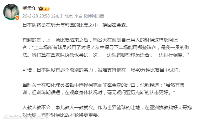 2026-03-01 07:10世预赛输给中国男篮后,日本队选择在下一场对阵韩国队时更换归化球员,换回霍金森、放弃使用归化老将柯克。那么上一场对阵中国队时,日本队为何要使用柯克,而不是实力更强的霍金森呢?
