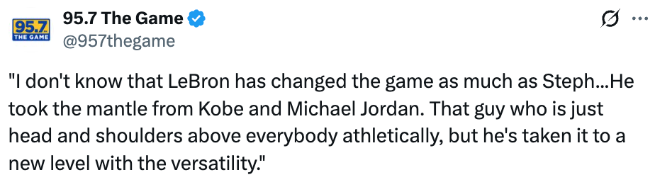 ”联盟过去这二三十年,能有这两位作为门面,真的非常幸运。我们的比赛彻底改变了。我认为库里以投射彻底改变了这项运动,原因我们都懂。我不认为詹姆斯改变比赛的程度能和库里相提并论。但他从科比、乔丹那里接过了火炬。他是那种身体素质碾压所有人的球员,但他又用全能性把比赛提升到了新层次。“