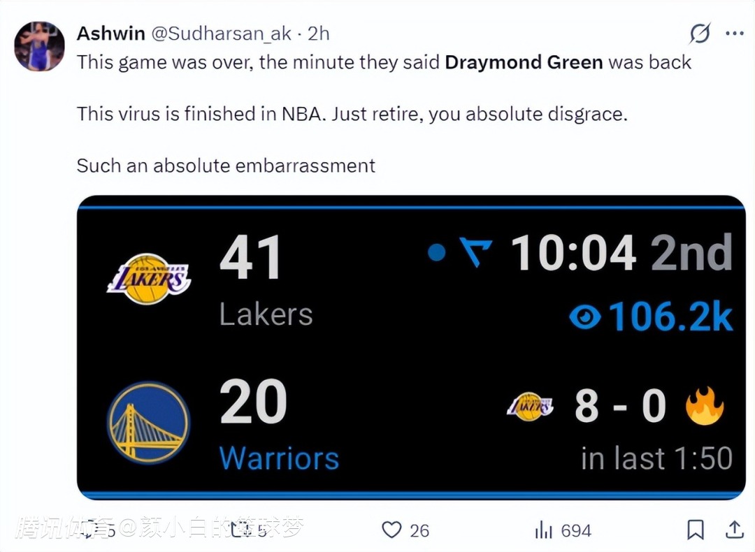 2026-03-01 15:20北京时间3月1日,金州勇士队101-129惨败洛杉矶湖人队。这场比赛勇士队一度落后湖人队32分之多,勇士队在主场输到麻。德雷蒙德-格林复出球队就输球让很多勇士媒体破防了,追梦在场-30球队最差。