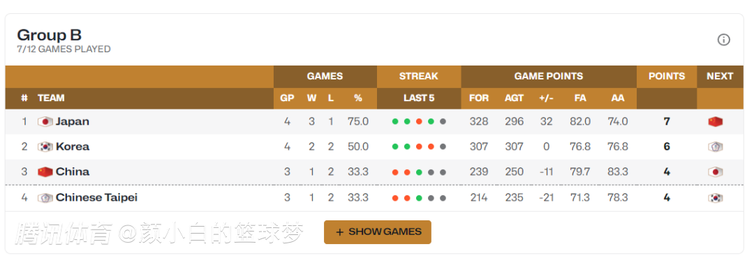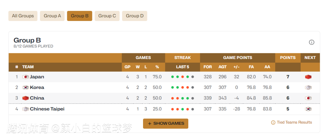 最新的B组积分榜已经出炉,中国男篮2胜2负积分6分依旧排在第三,中国台北队1胜3负5分垫底。