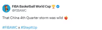 赛后,FIBA官方点赞中国男篮发文:“中国男篮在第四节打出的那波风暴真是太猛了!”