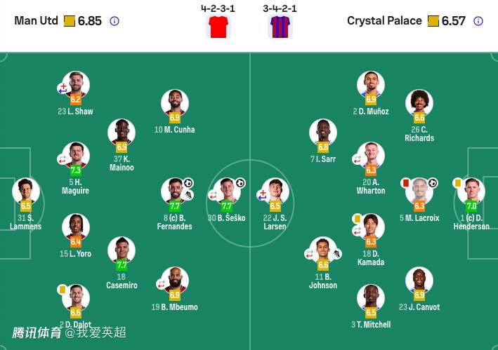 水晶宫首发:1-迪恩·亨德森、2-穆尼奥斯、26-理查兹、5-拉克鲁瓦、23-坎沃、3-米切尔、20-沃顿