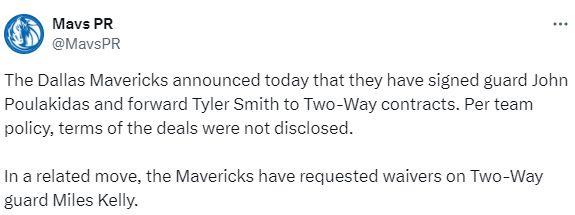 一签一裁!独行侠官方:球队与泰勒-史密斯签下双向合同 同时迈尔斯-凯利