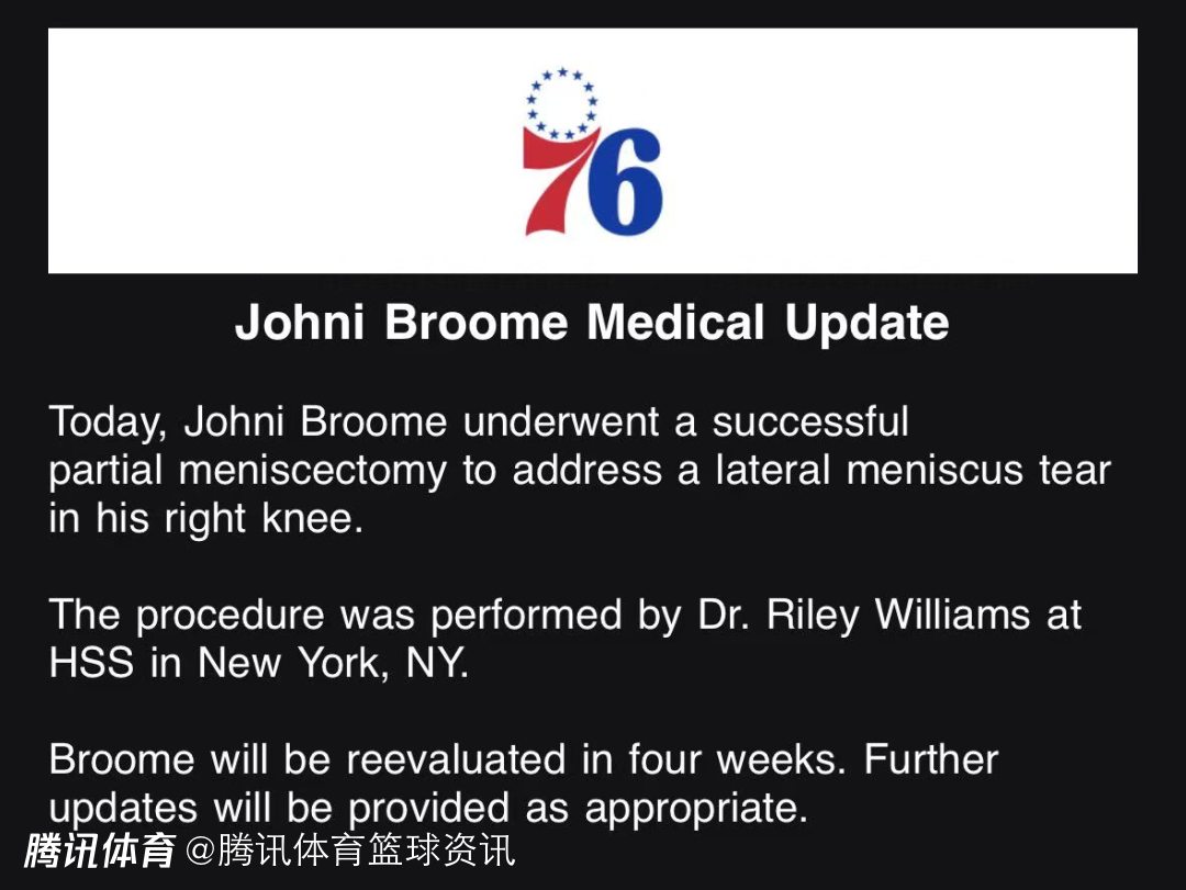 2026-03-02 08:10北京时间3月2日,76人队官方发布公告称,球队新秀约翰尼-布鲁姆此前已接受了右膝外侧半月板撕裂修复手术,具体为部分半月板切除术,其伤情将在四周后重新评估。