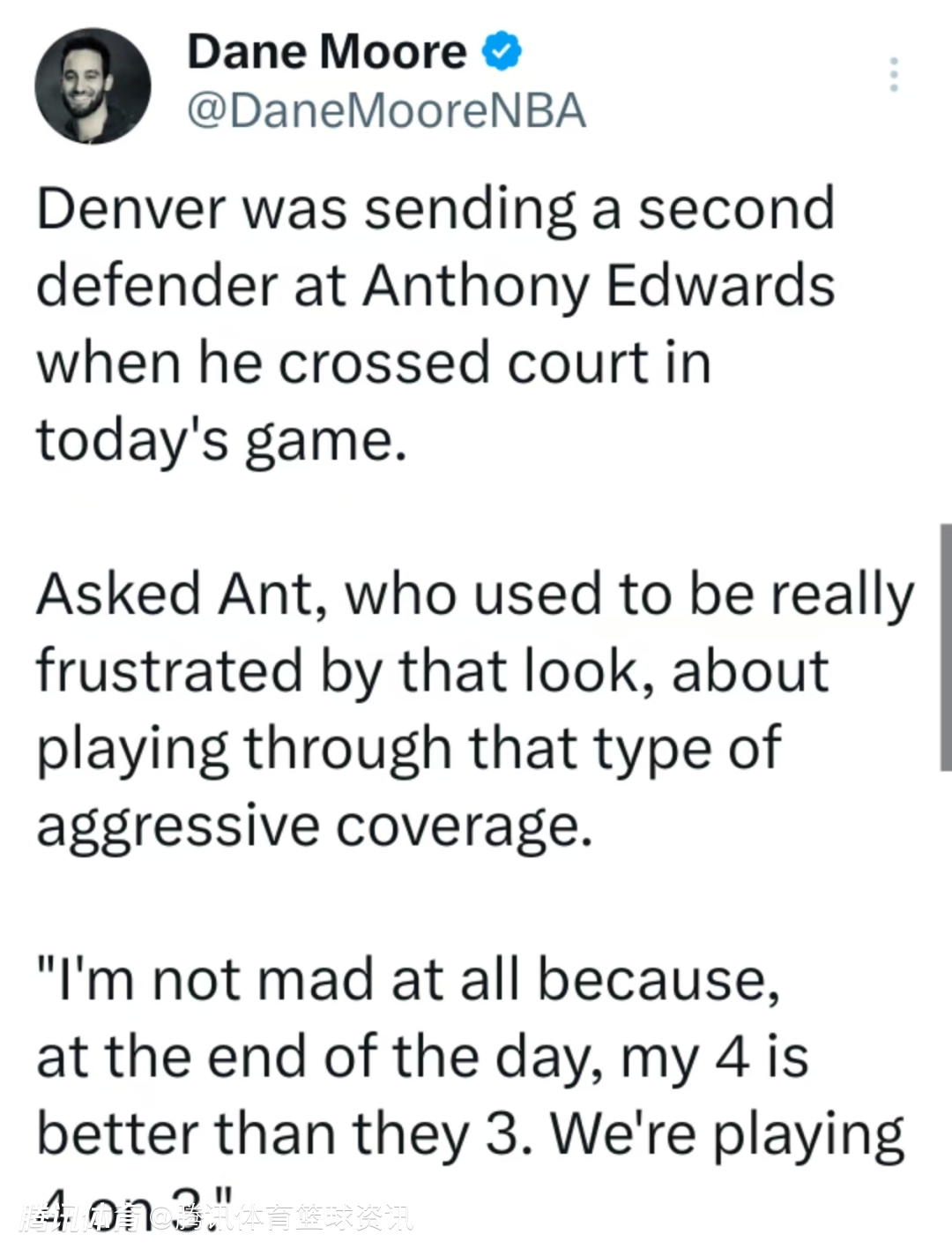 今日比赛中,爱德华兹一过半场,掘金队便立刻对他采取双人包夹的防守策略。记者问及这位曾因这种高强度防守倍感懊恼的球员,如今如何应对这类激进的防守方式,爱德华兹回应道:“之前我还总上头,他们一夹我,我就觉得,完了,这球没空间了。但现在不会了,我一点都不生气,因为说到底,我的四号位队友能打爆他们的三号位,我们等于是在打四打三。”