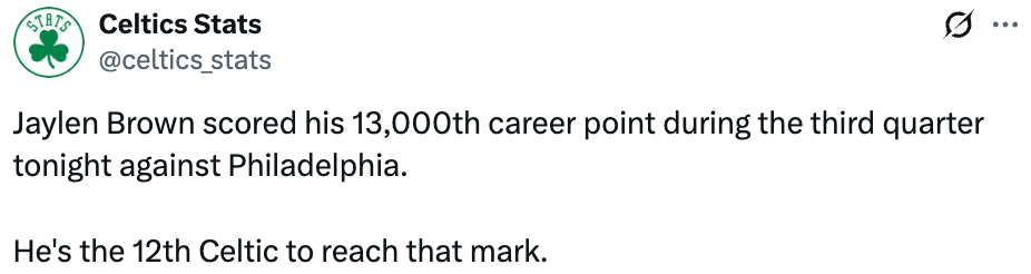 本场比赛之前,布朗的生涯总得分为12977分,第三节,他拿到本场比赛的第24分后,也让自己的生涯总得分突破13000大关,成为凯尔特人队史第12位达成该成就的球员。