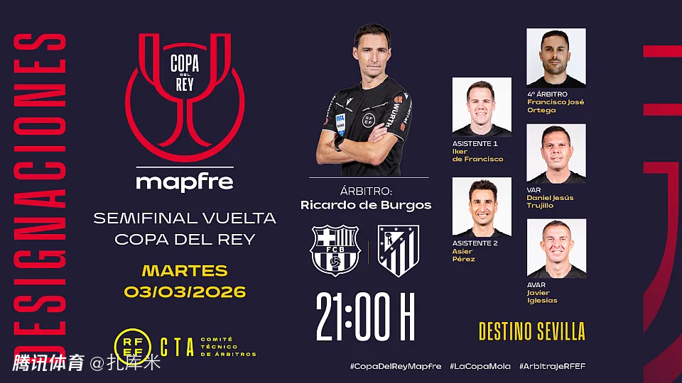2026-03-02 21:40西班牙国王杯次回合巴萨和马竞的赛前,西班牙足协公布了本场比赛的执法裁判组,其中里卡多·德·布尔戈斯担任主裁,而这名裁判此前曾被皇马TV炮轰,认为其执法一向偏袒巴萨。