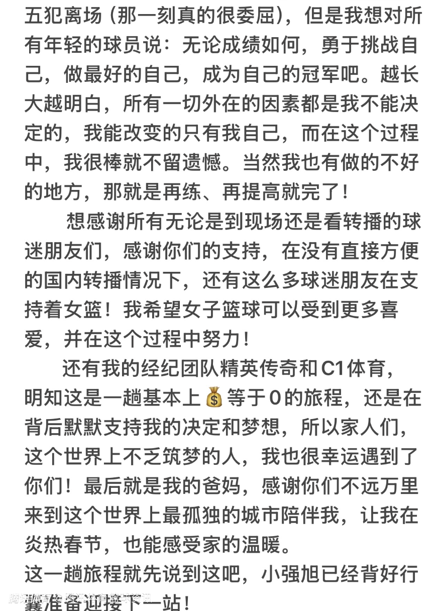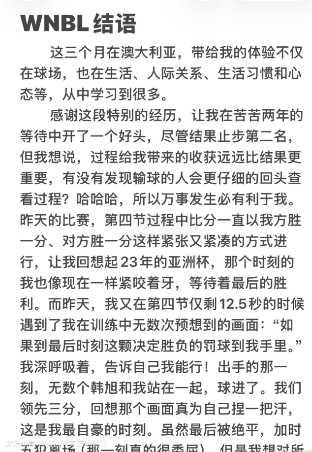 希望我的经历能对后面的年轻球员有所帮助,首个中国人参加的wnbl联赛赛季结束啦,它又一次带给我不同的惊喜和体验,我收获了国际友谊,完美的过程,一步一步脚踏实地的成长,希望更多的年轻球员包括教练、裁判、体能训练师、队医、工作人员可以走向国际,来体验不同的篮球世界。