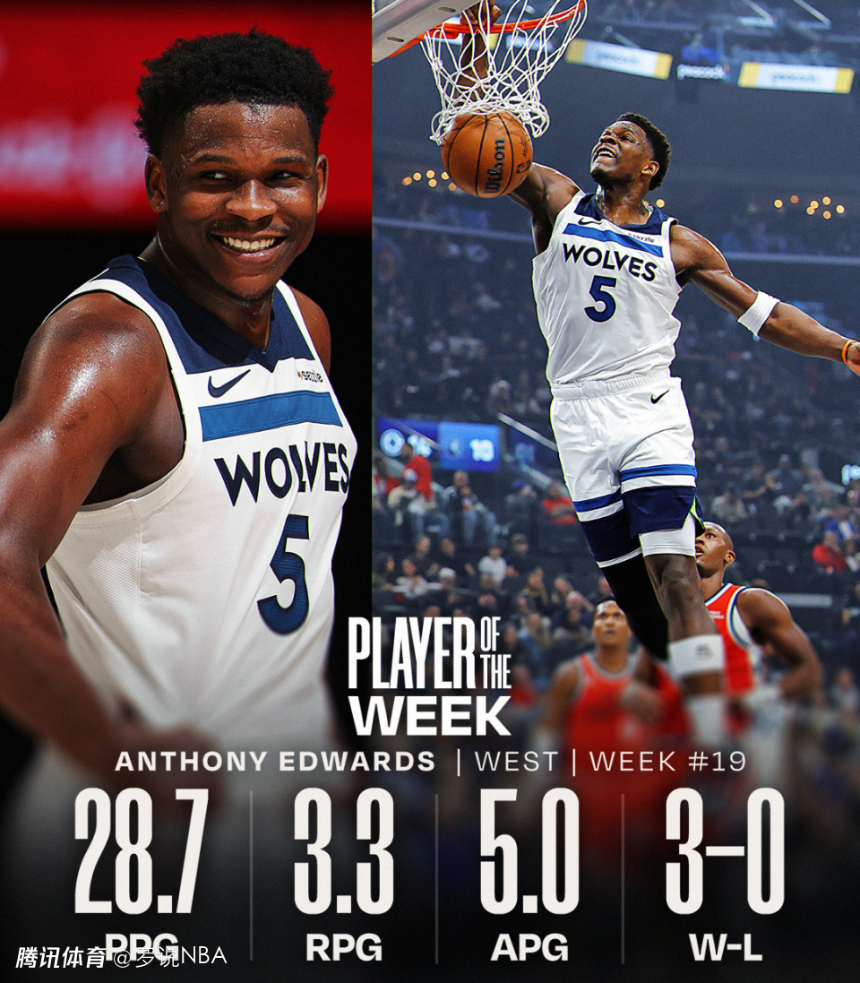 过去一周,爱德华兹率领森林狼取得3胜0负的战绩,场均28.7分3.3篮板5.0助攻。