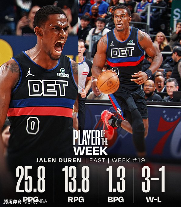 过去一周,杜伦场均25.8分13.8篮板,投篮命中率63.9%,帮助活塞打出3胜1负的战绩。