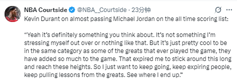 杜兰特表示:“没错,这肯定是你会去想的一件事。但我不会为此给自己太大压力,也不会想太多。不过,能和那些史上最伟大的球员归为同一行列,真的很酷。他们为这项运动付出了太多,也激励着我坚持这么久、达到如今的高度。所以我只想继续前进,继续激励他人,继续从传奇们身上学习,看看自己最终能走到哪一步。”