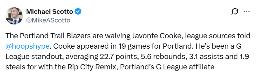 签下扬布拉德后,开拓者决定裁掉库克。库克为开拓者出战了19场比赛,他在G联赛表现十分出色,代表开拓者下属球队混音队场均得到22.7分、5.6篮板、3.1助攻、1.9抢断。目前,开拓者拥有2名双向合同球员与15名标准合同球员,球队18人大名单还未满员。