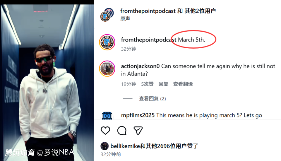 特雷-杨在自己IG上也晒出短片,配文:3月5日(当地时间)。