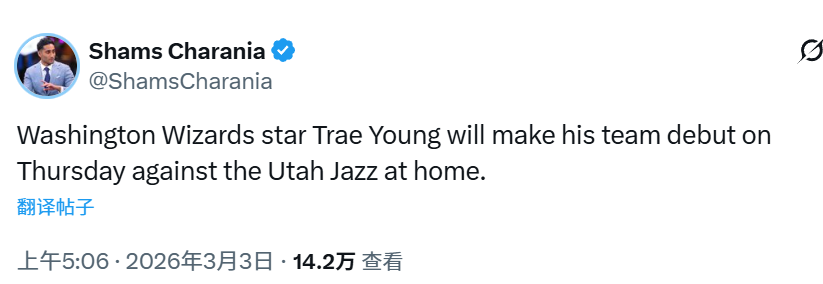 2026-03-03 06:10北京时间3月3日,据名记Shams报道,华盛顿奇才队控球后卫特雷-杨预计将在周五对阵犹他爵士的比赛中完成新球队首秀。特雷-杨自2025年12月28日起因膝盖与股四头肌伤势一直缺阵。他是在2026年2月交易截止日前被交易至奇才队的。
