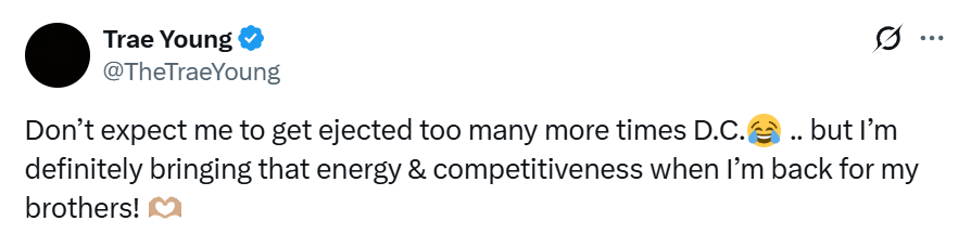 特雷-杨写道:“别指望我会再被驱逐太多次了,华盛顿……但等我回来,我一定会为我的兄弟们带去那股激情和竞争力!”