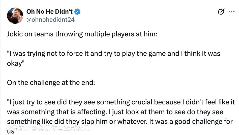 谈及比赛末段的教练挑战,约基奇表示:“我只是想看看,裁判是不是看到了什么关键东西。因为我并不觉得那球有什么影响比赛的动作。我就看着他们,想确认他们是不是看到了打手之类的情况。总的来说,这对我们是一次很好的考验。”