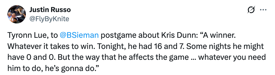 谈到邓恩,卢表示:“他是个赢家。为了胜利,他愿意付出一切。今晚他拿到16分7助攻,有些夜晚他可能数据是0分0助攻。但他影响比赛的方式——无论你需要他做什么,他都会去做。”此役邓恩首发出战26分钟,投篮10中7,三分球4中2,拿到16分7篮板7助攻2抢断,+18的正负值为全队最高。