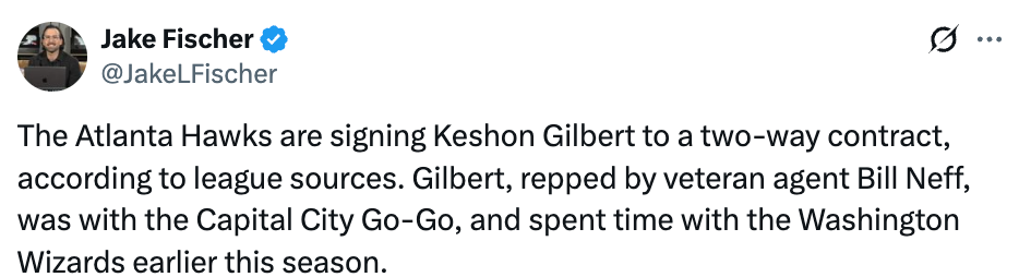 2026-03-04 00:00北京时间3月3日,据美记Jake Fischer报道,亚特兰大老鹰队将与凯肖恩-吉尔伯特签下一份双向合同。