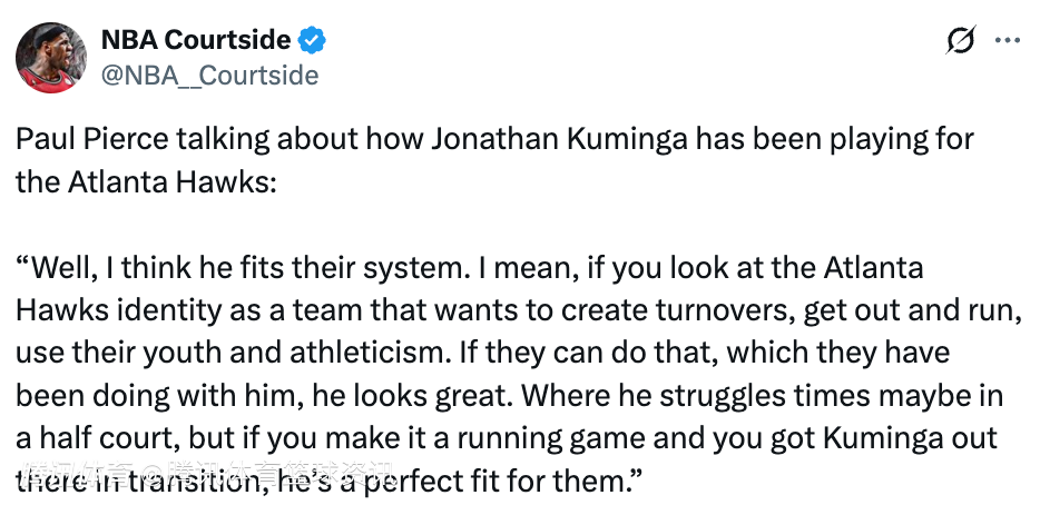 皮尔斯表示:“我认为他很适配老鹰的体系。你看,老鹰的球队定位就是制造失误、推快攻反击,充分利用年轻和运动天赋。当他们用库明加打出这种风格时 —— 他们也确实这么做了 —— 他的表现就非常出色。”